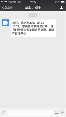 “微信企业号”,又称为“企业微信”,是微信平台为企业客户提供的移动应用入口。您可以通过微信企业号向企业的员工发送多种类型的微信消息。目前EasySQLMAIL可以向企业员工发送微信文字消息。例如象下面这样: