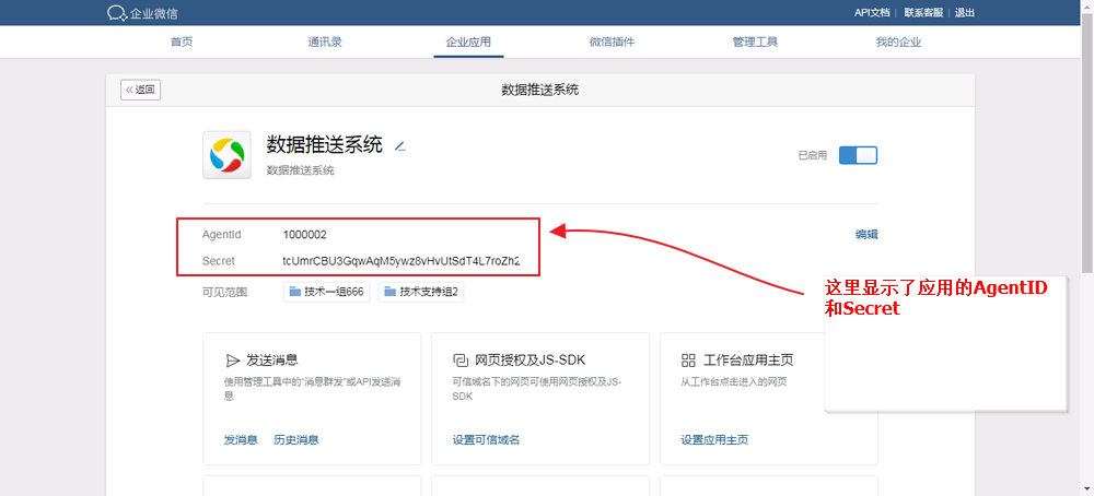 查看应用的AgentID和Secret