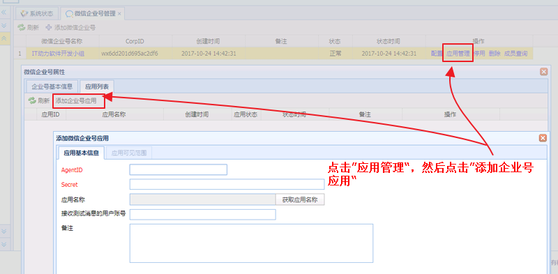 微信企业号配置好后,还需要在企业号中配置用于发送消息的应用信息。在“微信企业号管理”界面中点击要添加应用的企业号条目右侧的“应用管理”,打开企业号的应用列表界面,然后点击工具条上的“添加企业号应用”按钮,打开添加微信企业号应用对话框。