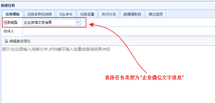 选择任务类型为“企业微信文字消息”