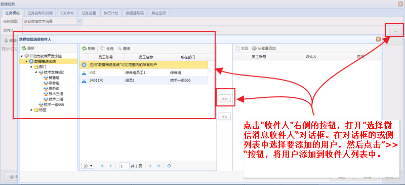 企业号应用配置完成后,您可以在任务中向企业号中的员工发送消息。注意:目前EasySQLMAIL支持发送文字消息,将来的版本中会开放更多的消息类型。
