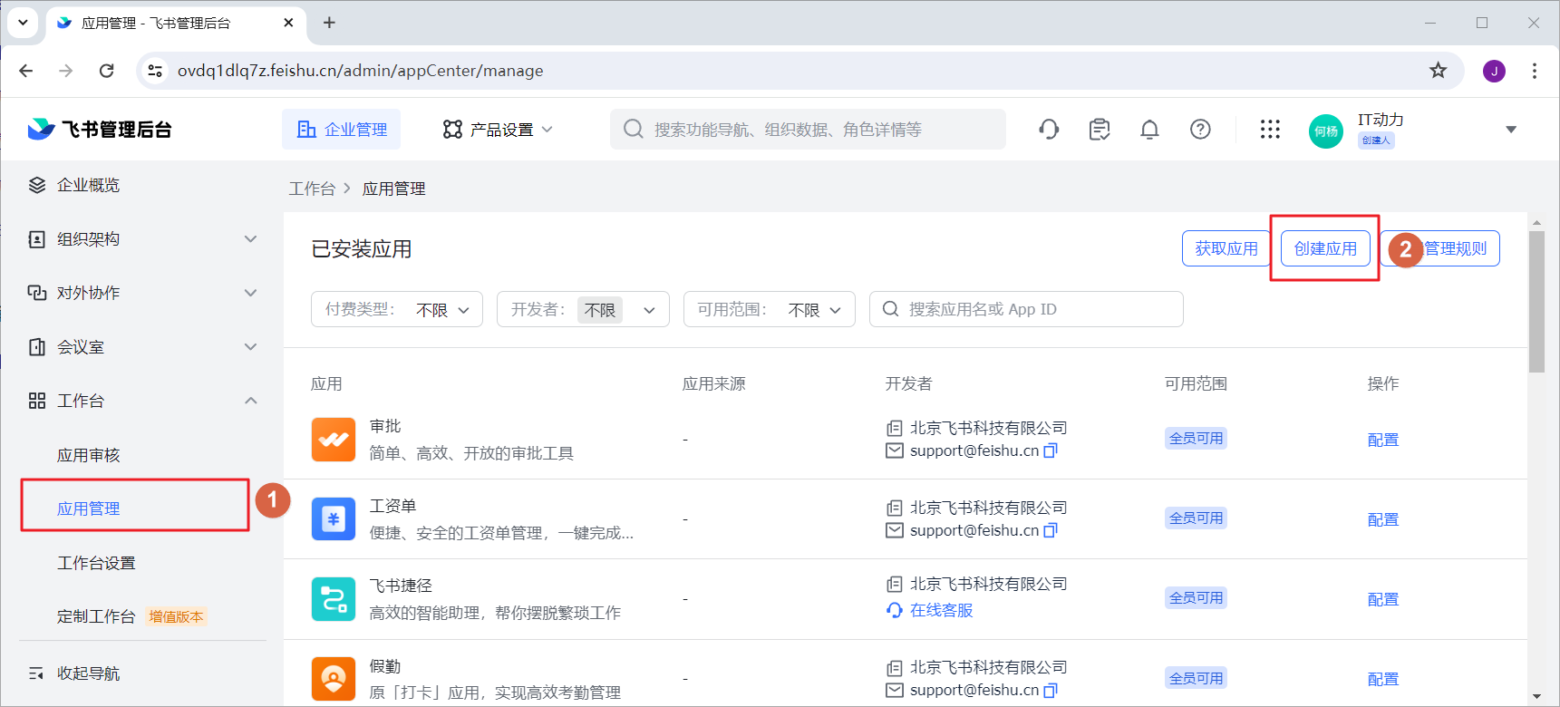 Step1: 登录飞书管理后台,在"工作台"->"应用管理"中创建应用