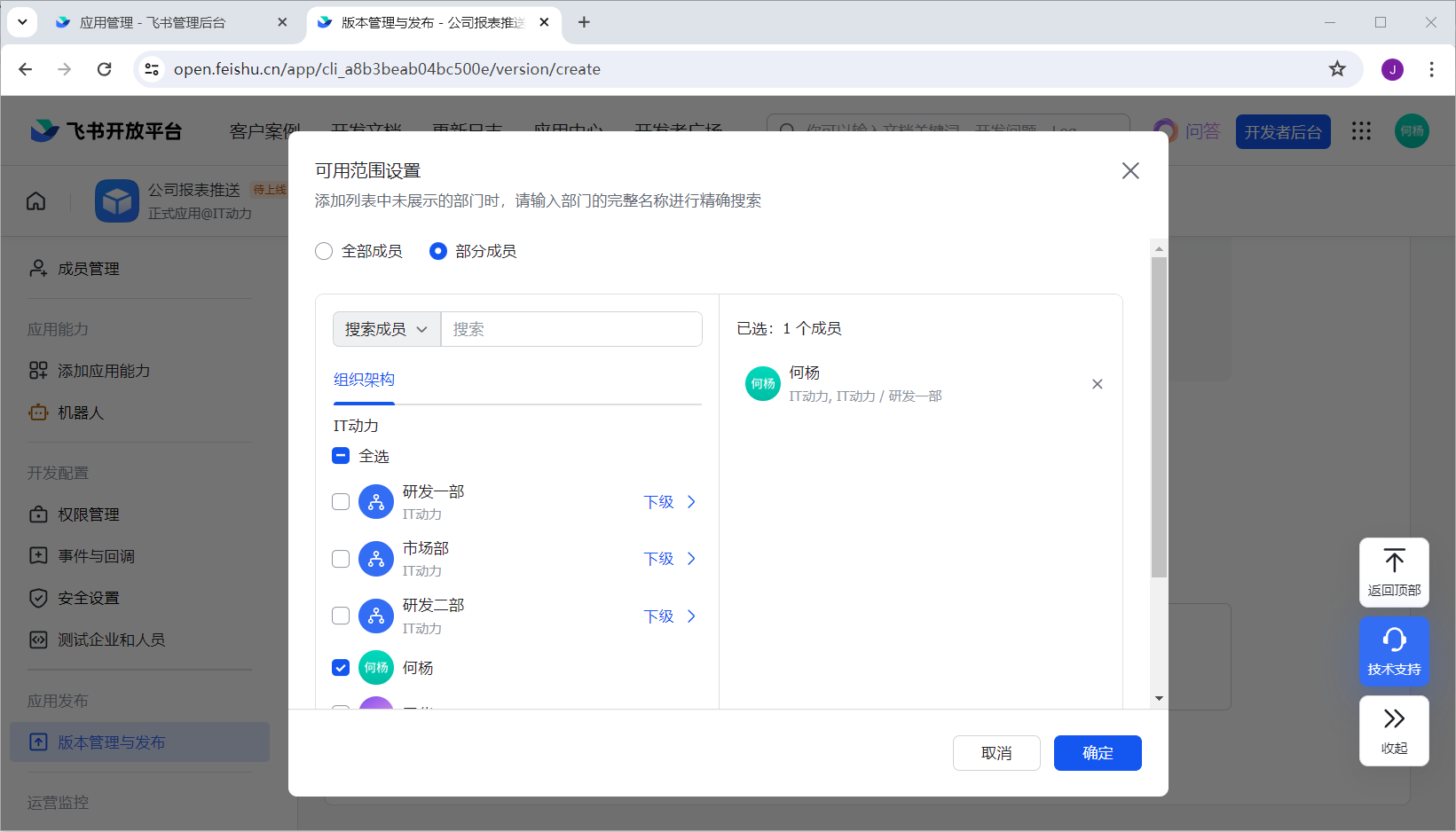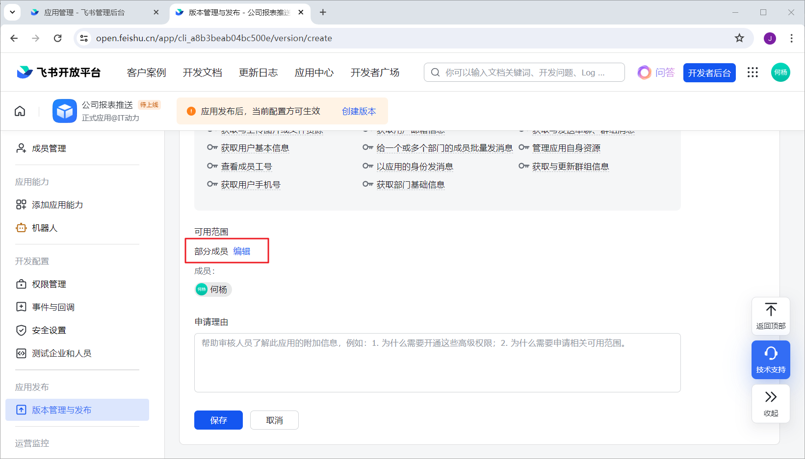 提示:应用只能向这里选择的可用范围内的成员发送消息。