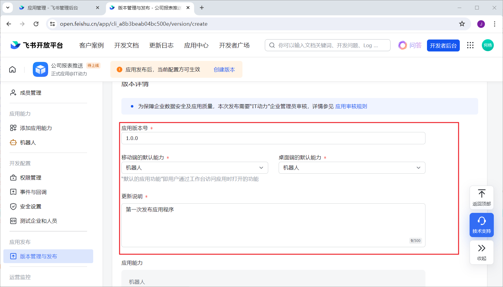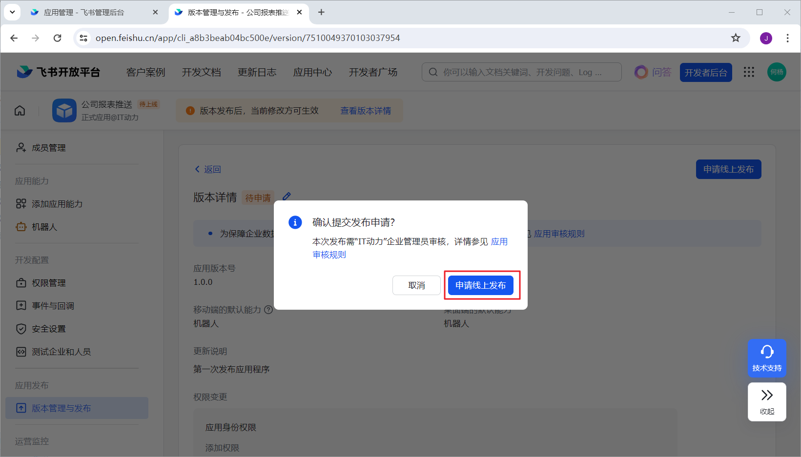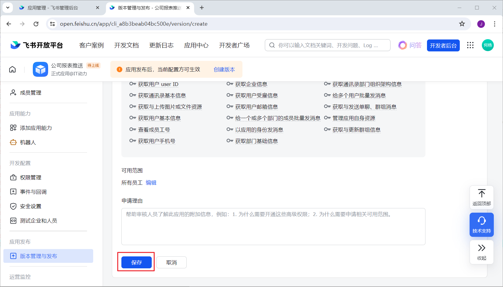 Step10: 点击"保存",然后点击"申请上线发布"。在企业管理员对新版本进行审批后,应用即可正常使用。