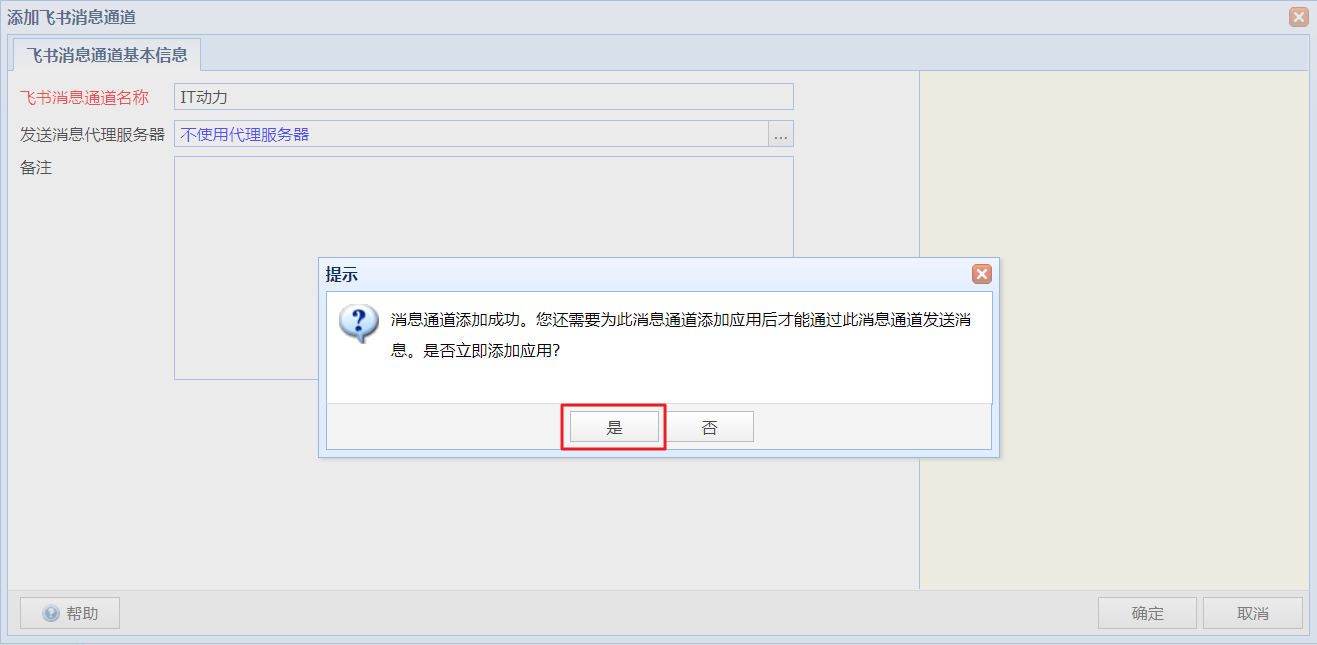 Step3: 点击"确定"按钮保存消息通道信息,然后继续为消息通道添加应用。