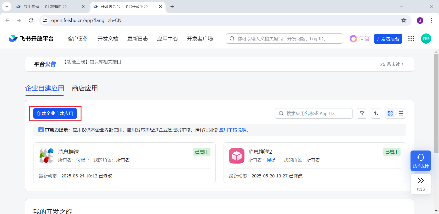 Step2: 跳转到"开发者后台"页面后,点击"创建企业自建应用"按钮