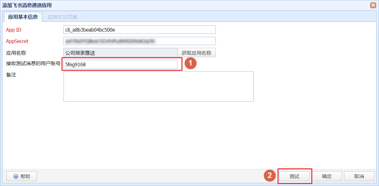 提示:您可以在这里输入"接收测试消息的用户账号"(即用户的"用户 ID",可以在飞书后台管理的"组织架构"->"成员与部门"中查询到),然后点击"测试"按钮,EasySQLMAIL会通过这个应用向指定的用户发送一条测试消息。