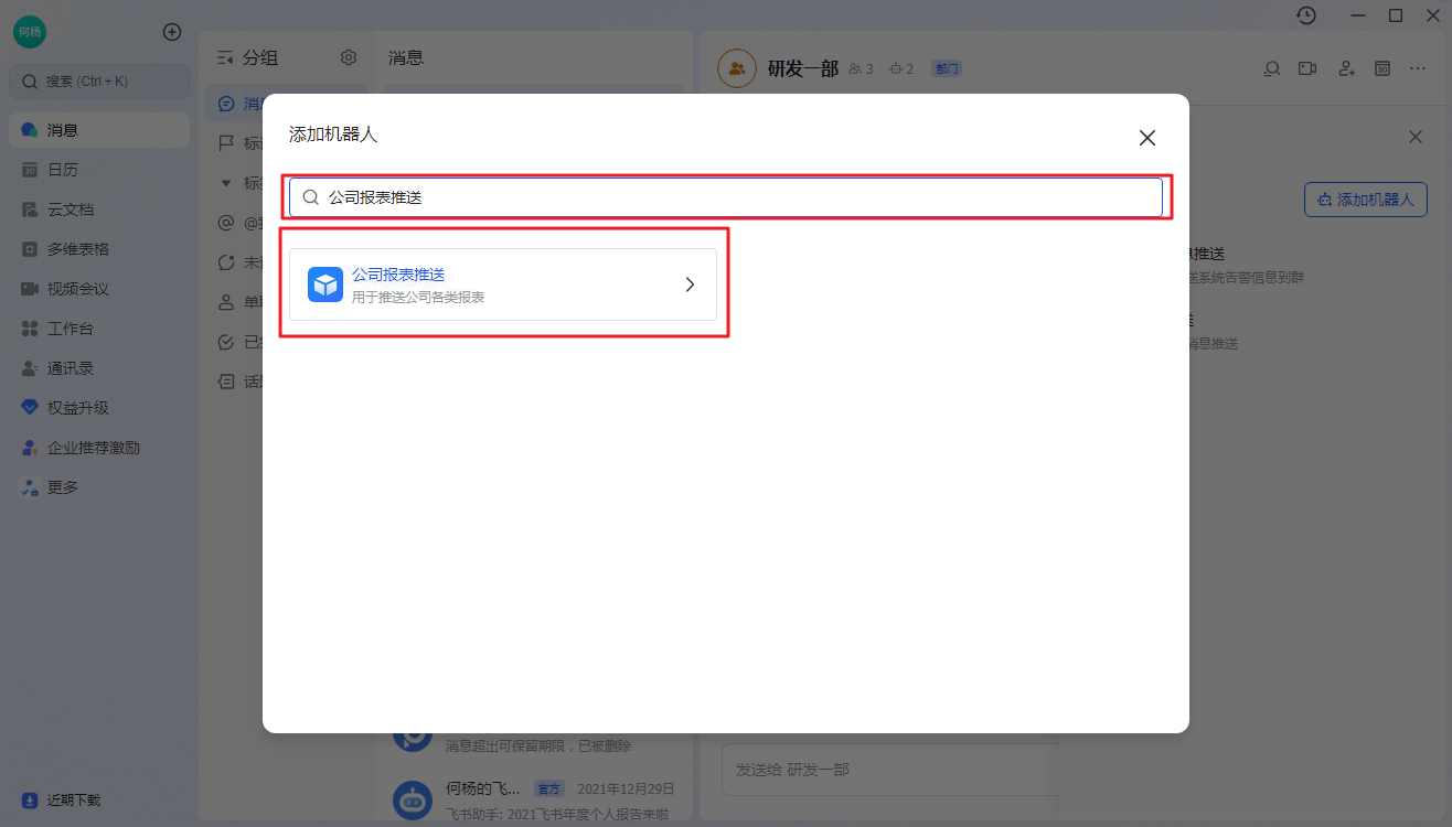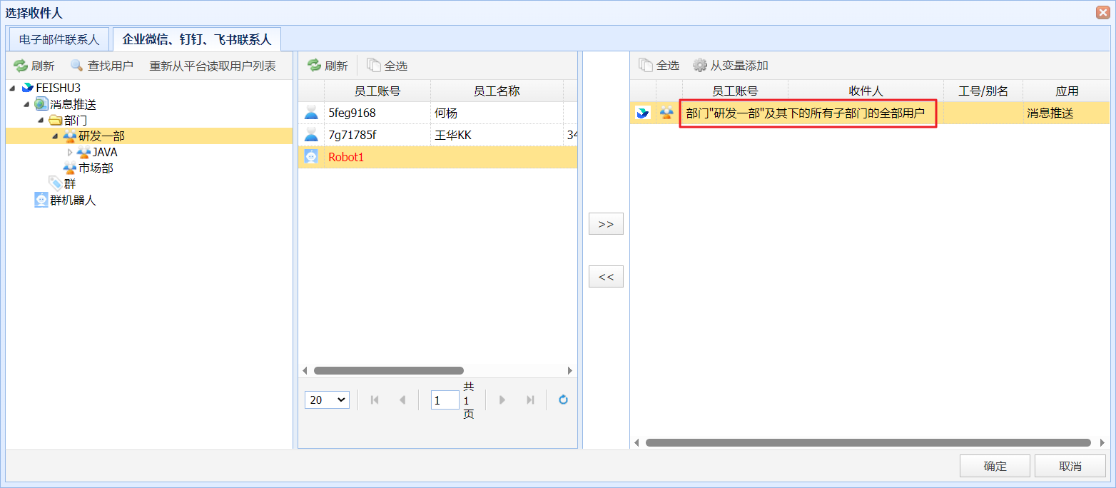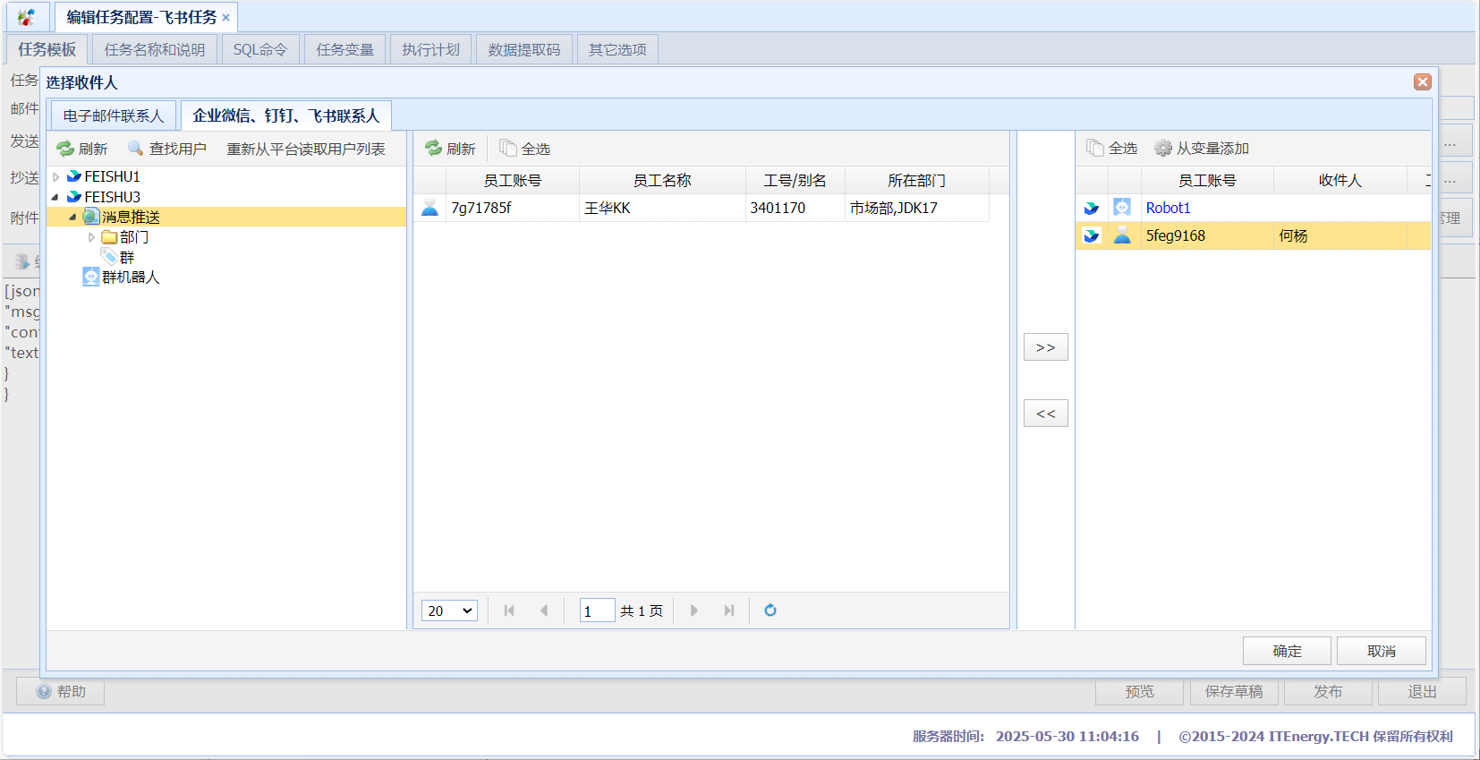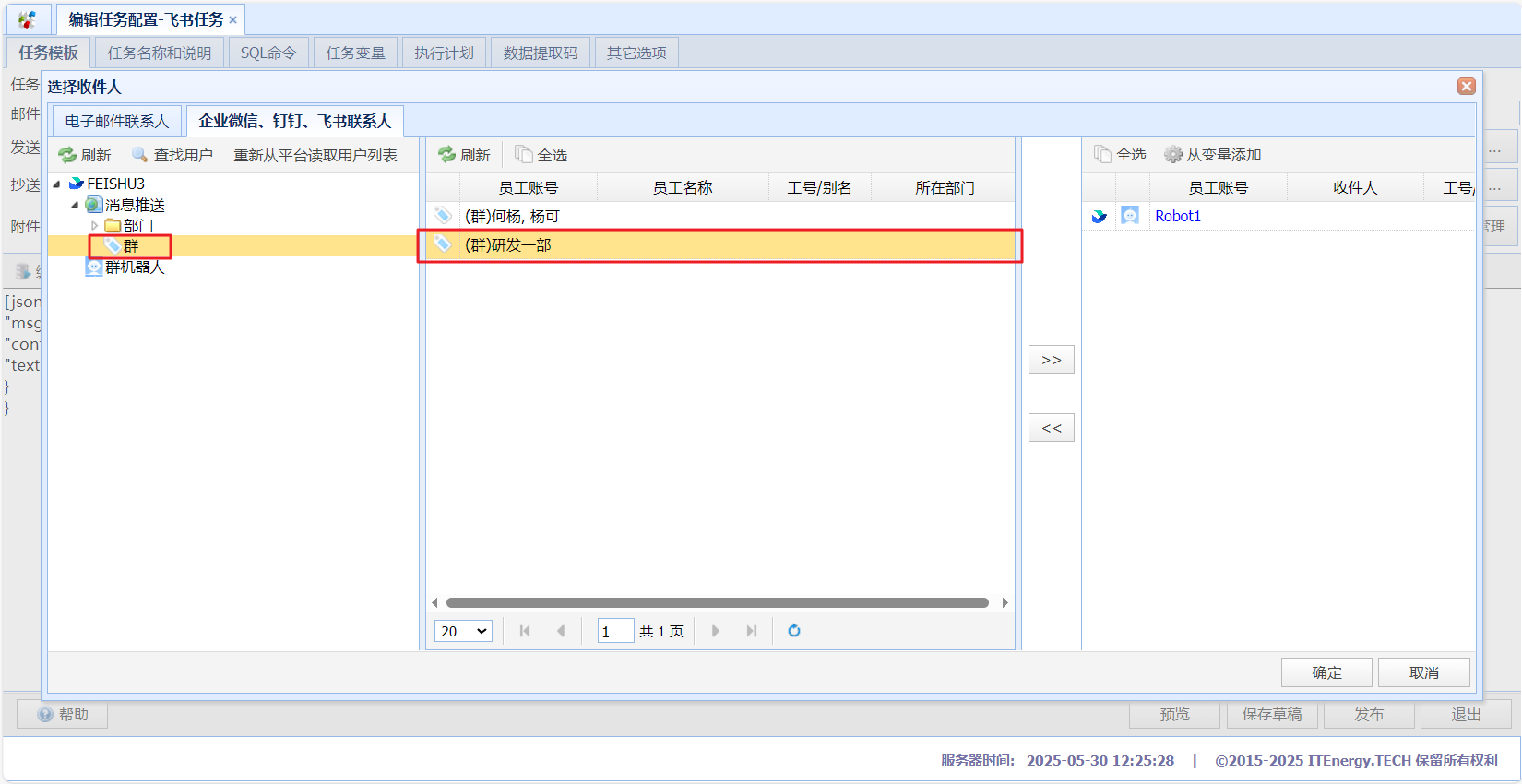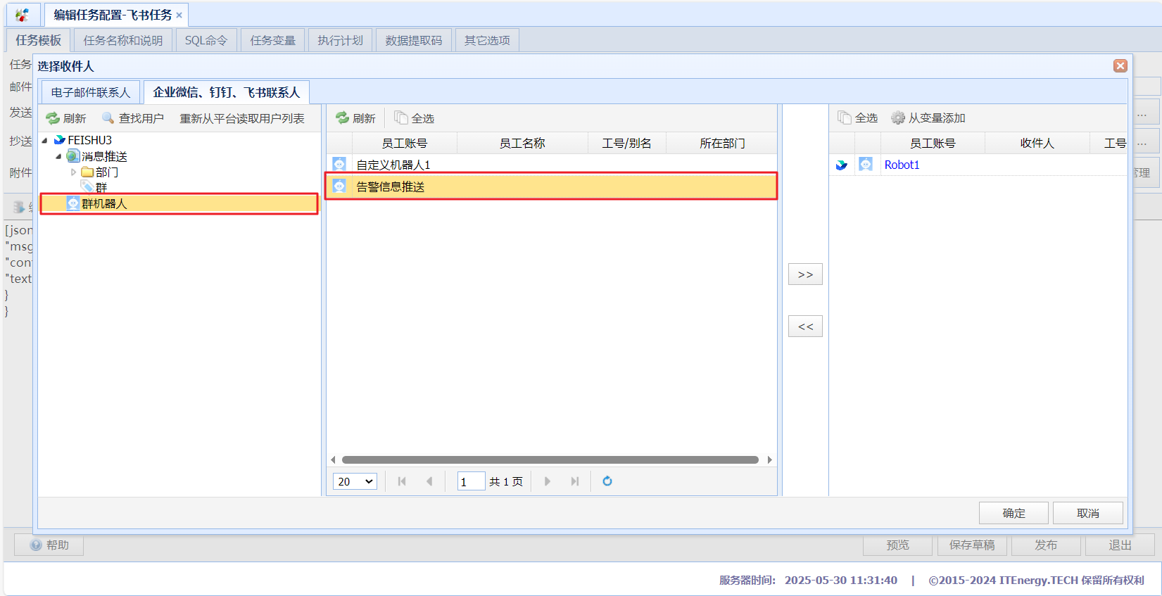 群机器人添加完毕后,在配置任务时选择对应的群机器人作为收件人,系统会把消息通过所选的群机器人发送到指定的群。