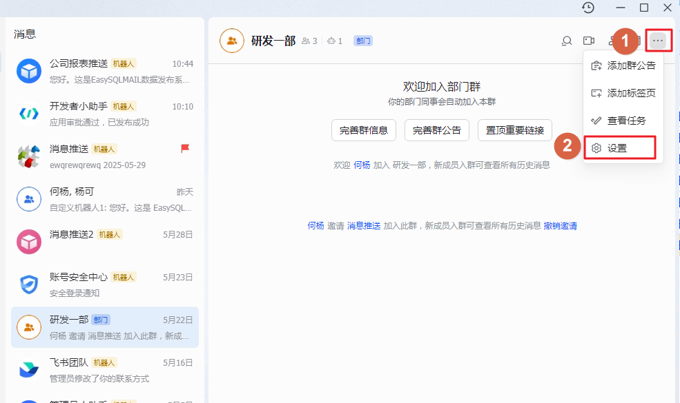 打开飞书的PC客户端,进入要发送消息的群,点击"设置"菜单。