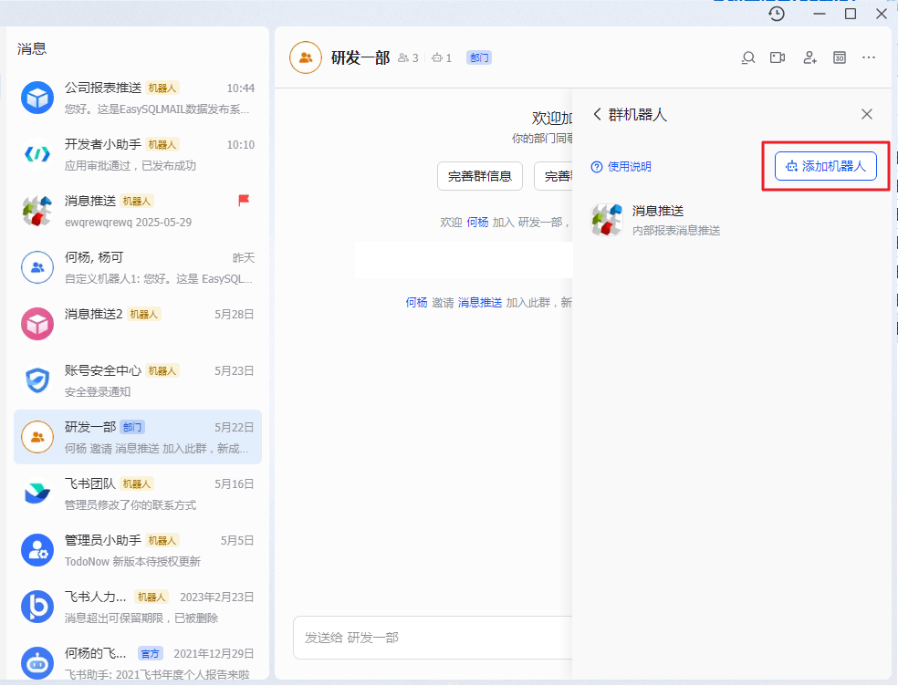 您可以在飞书群中创建一个自定义机器人,然后在EasySQLMAIL中使用这个群机器人推送消息到群。
