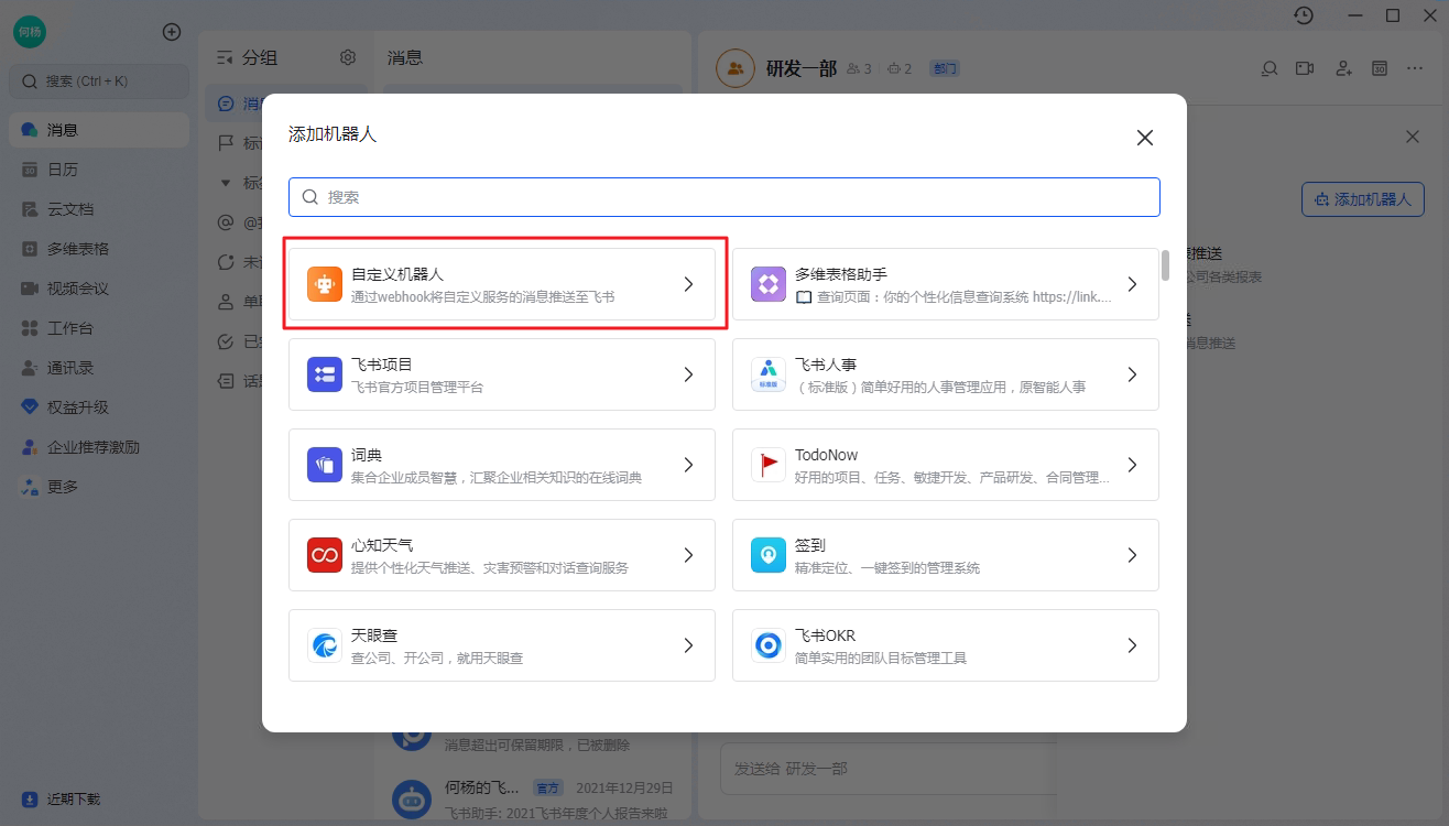 提示:由于飞书API的限制,系统仅能通过自定义群机器人推送文字消息和markdown消息。如果要推送文件和图片消息到群,请使用"自建应用"进行推送。