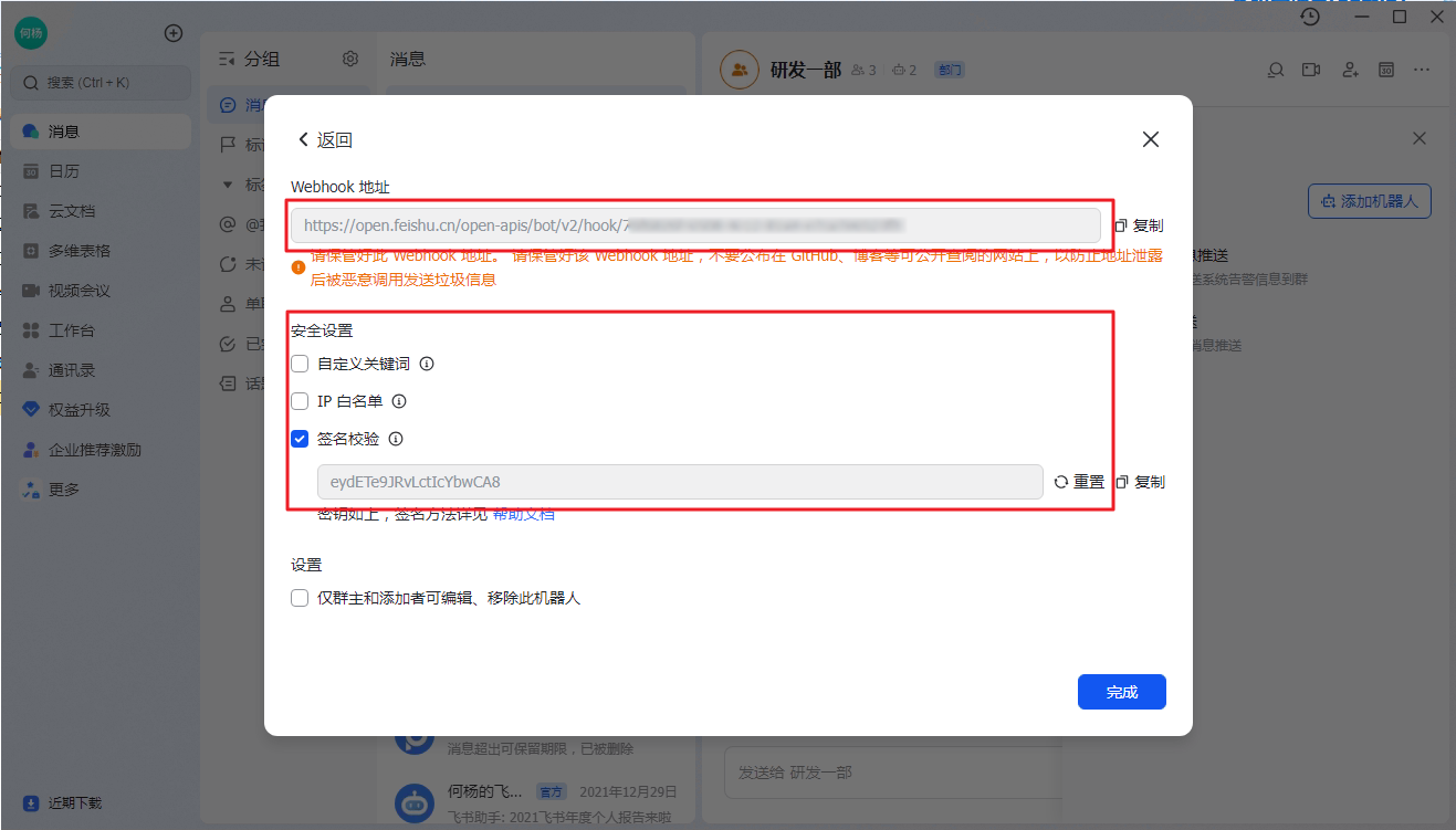 机器人添加成功后,记录下Webhook地址。并为机器人设置安全选项。