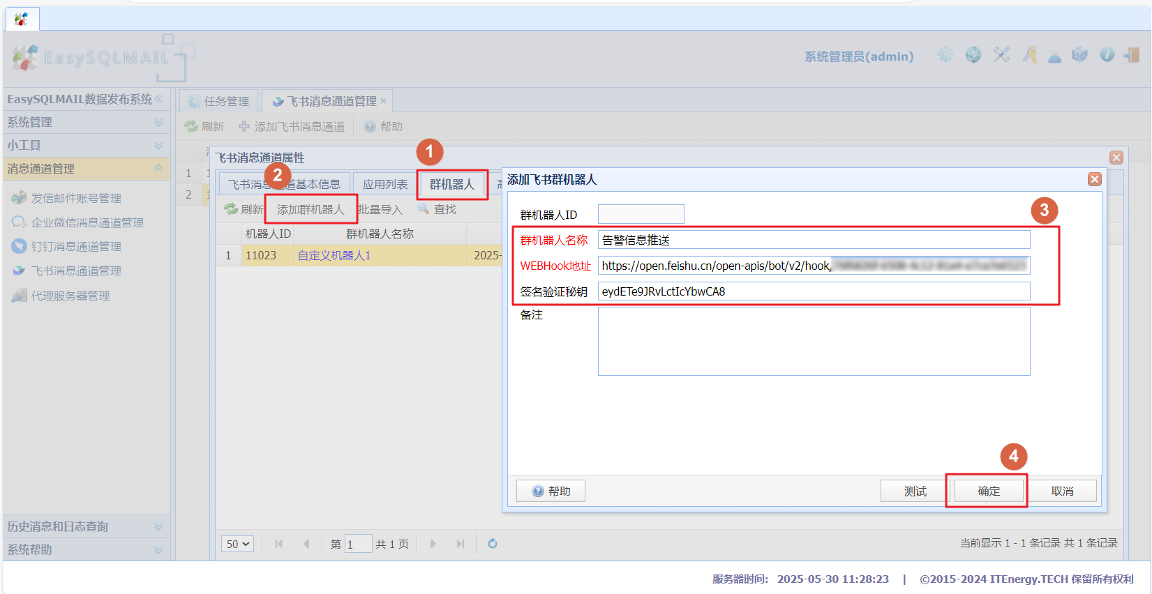 在推送消息到飞书前,需要在系统中配置飞书消息通道。EasySQLMAIL支持配置多个飞书消息通道,并可以为每个消息通道配置多个应用,用于推送不同类型的信息。