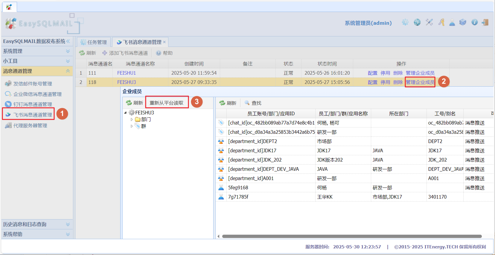 Step2: 添加成功后,在EasySQLMAIL的"飞书消息通道管理"中重新读取飞书通信录。