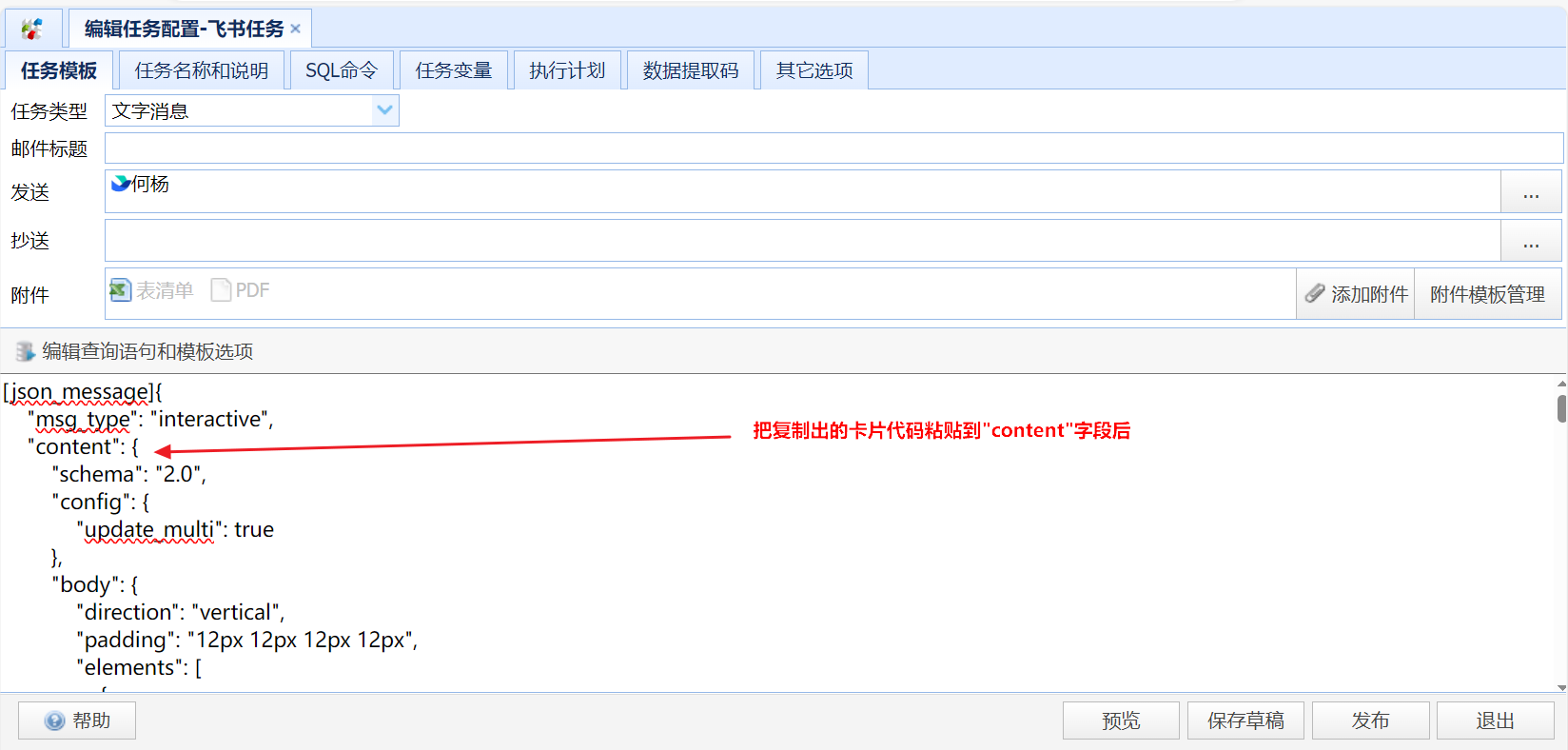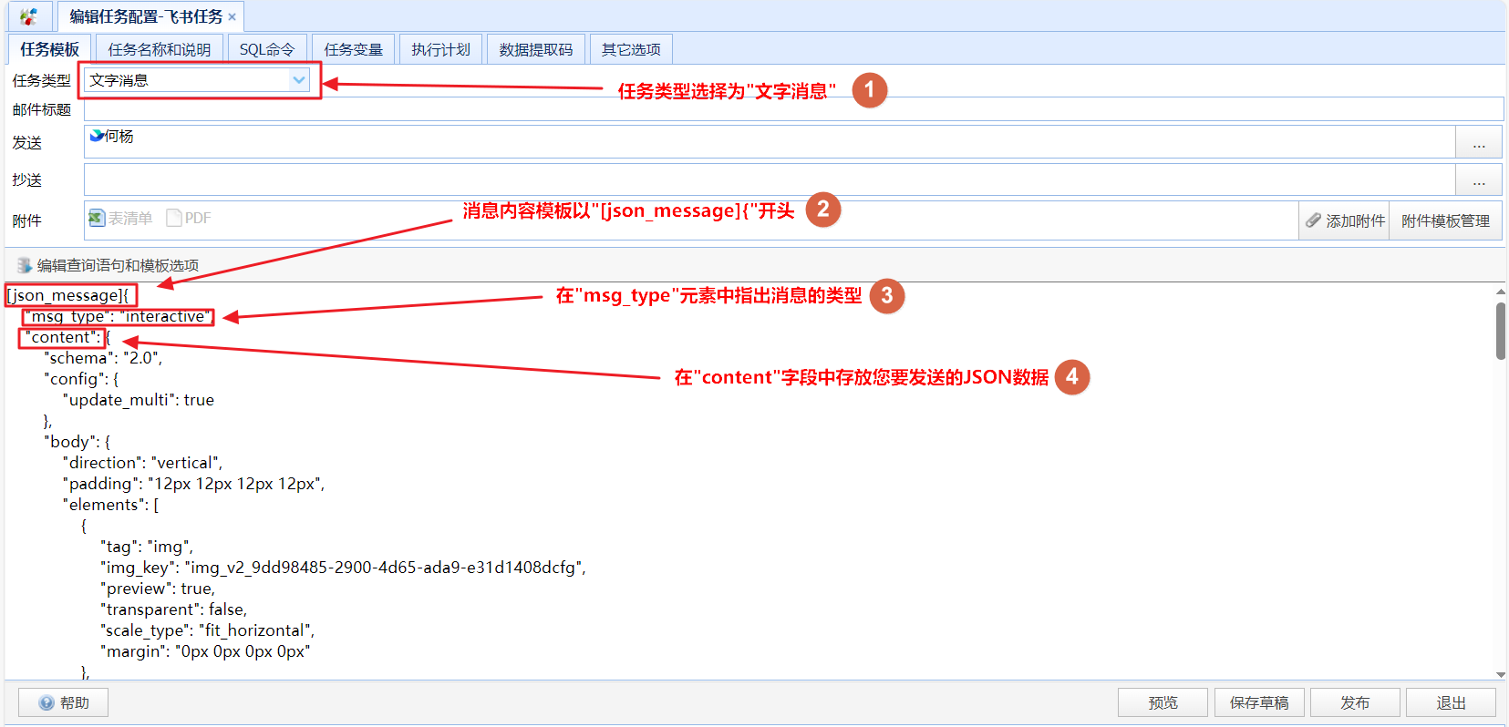 A: 您可以把任务类型设置为"文字消息",然后在任务的正文模中输入您自己的JSON代码。系统会把您的JSON代码转换为飞书消息的代码进行发送。