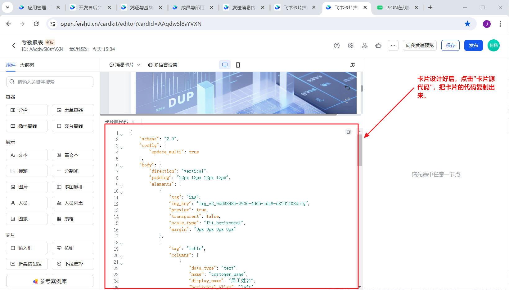 提示:如果要发送卡片消息,您可以预先使用"飞书卡片搭建工具"来生成卡片的JSON代码。