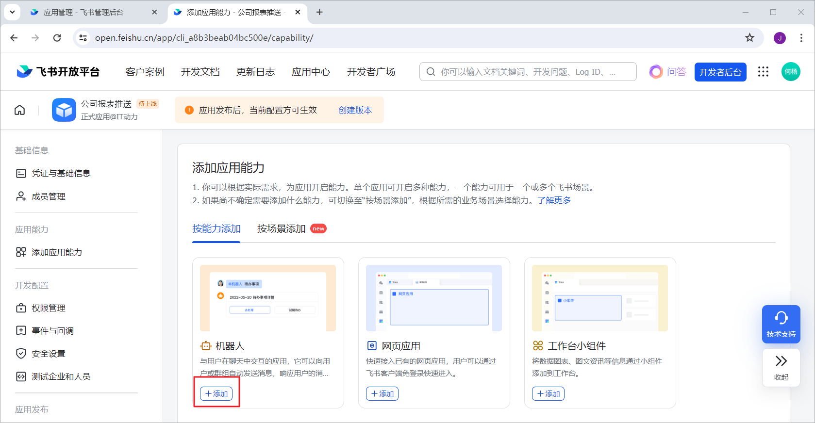 Step4: 应用创建成功后,在"添加应用能力"页面中为应用添加"机器人"能力。