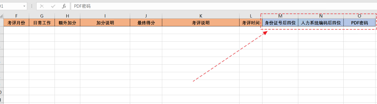 1. 在"员工考评表"模板中添加三个列:"身份证号后四位","人力系统编码后四位"和"PDF密码"。
