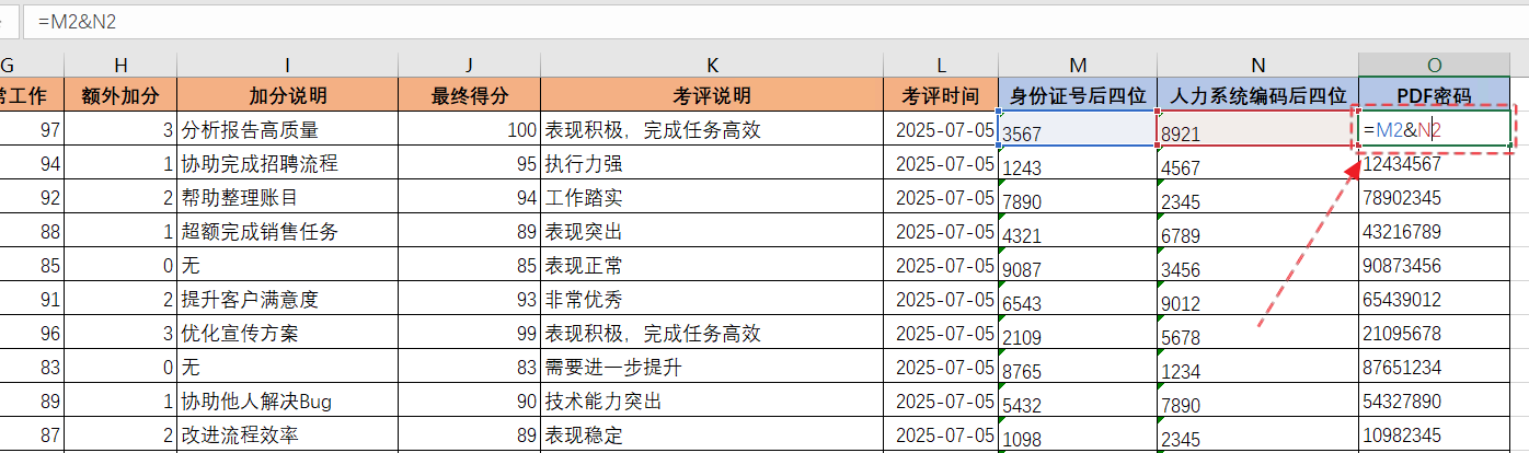 注意在执行任务时导入的"月度考评表清单"表中,也要添加这三个列,其中"PDF密码"列的内容使用Excel公式"=M2&N2"生成。