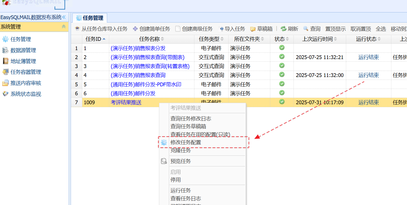 2. 在EasySQLMAIL中找到"考评结果推送"(在"如何把Excel表格里的记录点对点发给员工"一文中配置好的推送任务),在任务名称上点击右键,选择"修改任务配置"菜单,打开"编辑任务配置"对话框。