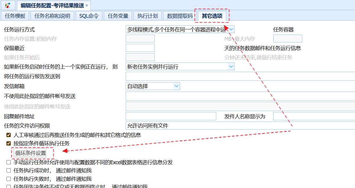 3. 在"其它选项"Tab页中点击"循环条件设置"按钮,打开"任务循环条件设置"对话框。