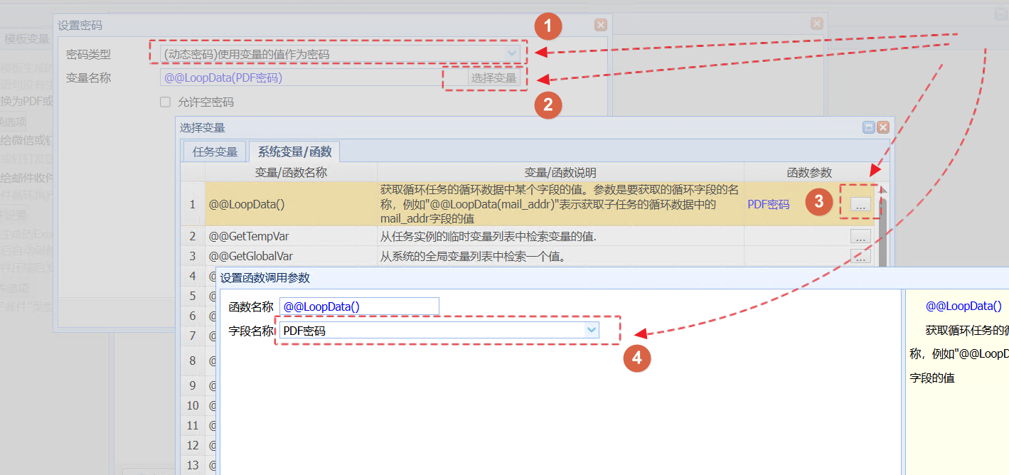 8. 在"设置密码"对话框中,"密码类型"选择为“(动态密码)使用变量的值作为密码”,然后点击"选择变量"按钮,并选择"@@LoopData(PDF密码)"变量作为密码的来源。