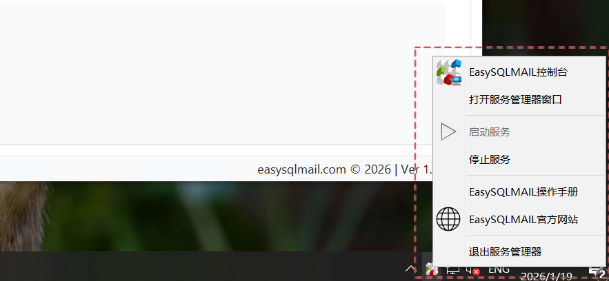 服务管理器运行时,会在桌面右下角的任务托盘中显示EasySQLMAIL程序的图标。您可以双击这个图标打开服务管理器的主界面,也可以右键单击这个图标显示服务管理器的菜单。