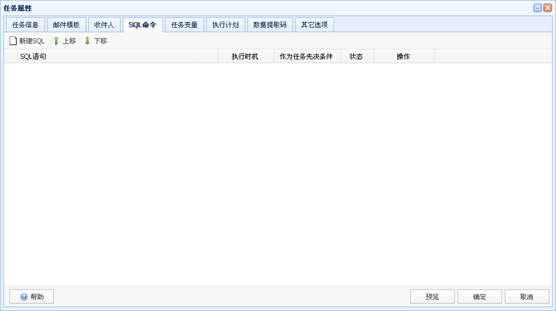 点击"任务属性"界面中的"SQL命令"Tab页,进入SQL命令管理界面。