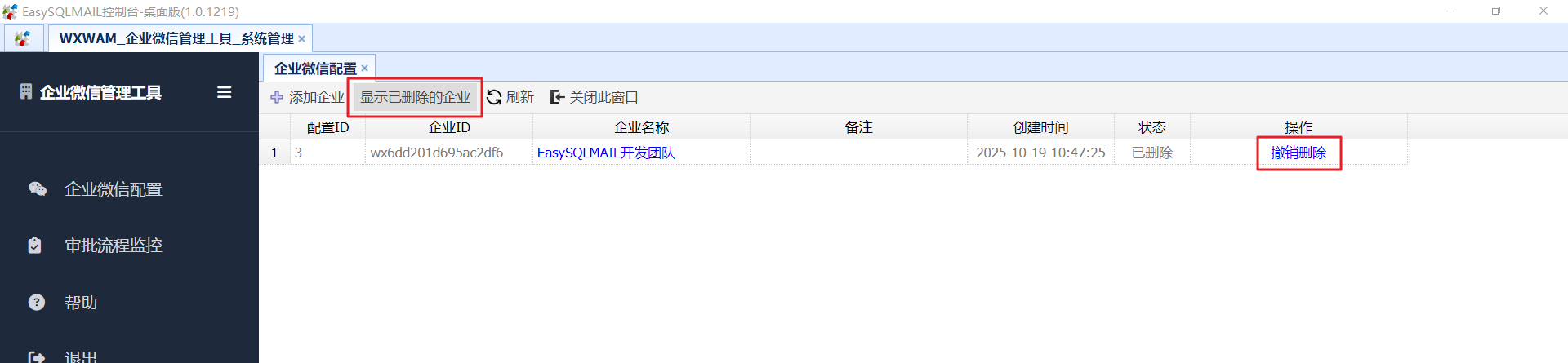 (2) 如果企业被删除后需要恢复使用,您可以在"企业微信配置"中点击"显示已删除的企业",然后找到要恢复的企业,点击"撤消删除"即可。