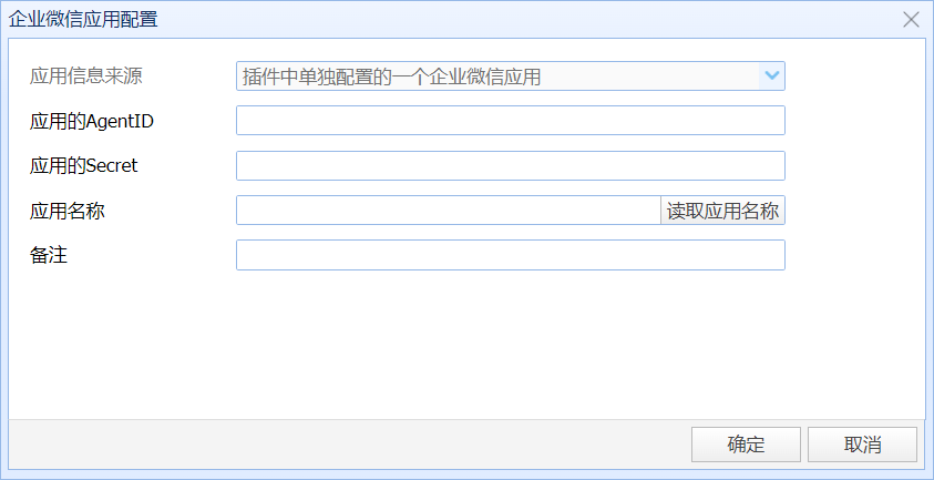 输入"AgentID"和"应用的Secret"后,请点击"应用名称"右侧的"读取应用名称"按钮。系统会调用企业微信的API自动读取此应用的名称。 |