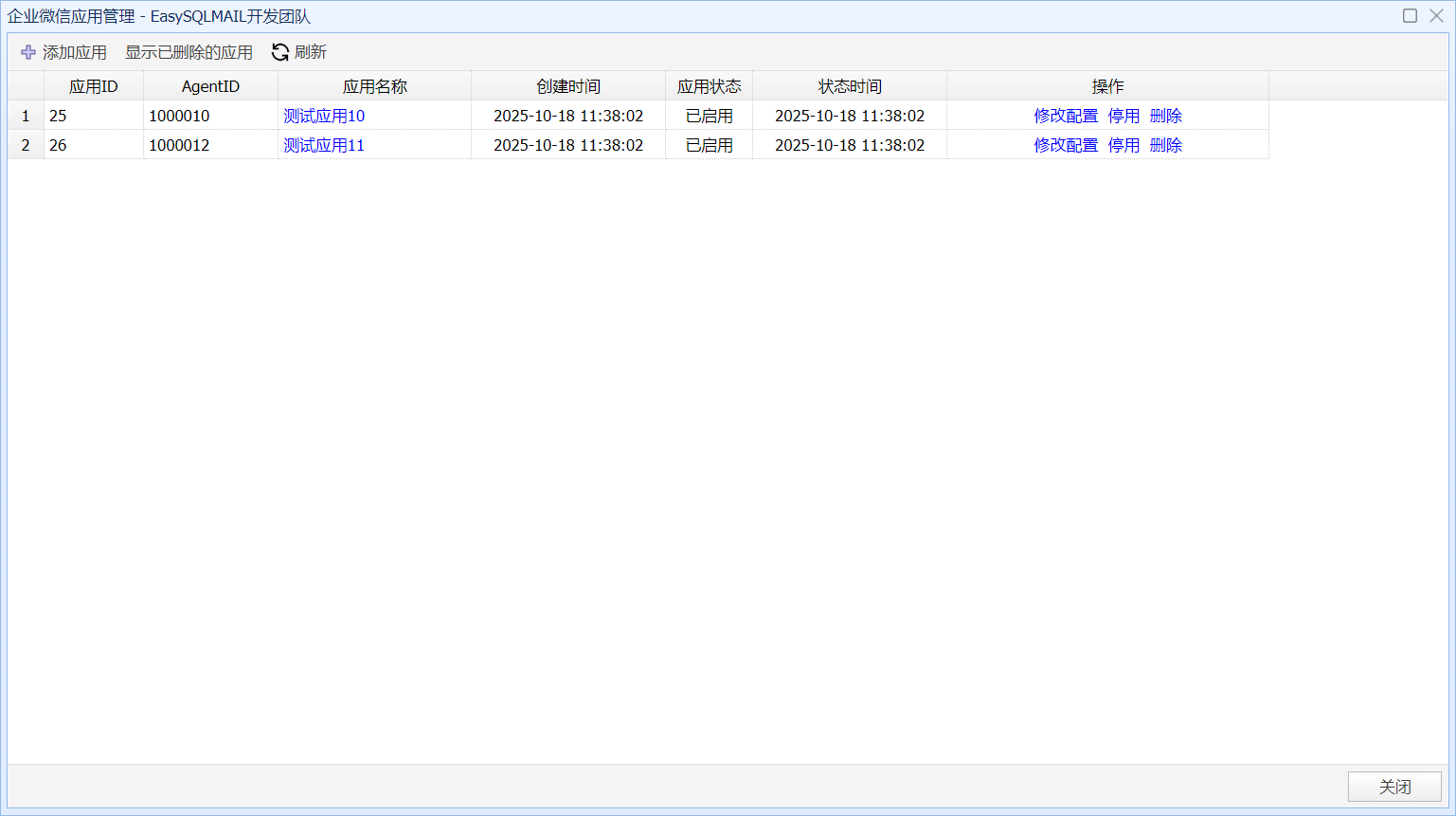 提示:如果上一步中添加企业信息时"企业信息来源"选择了"与系统的企业微信消息通道中的企业关联",则不需要再在这里单独添加应用信息。系统会自动把您在EasySQLMAIL的企业微信消息通道中配置的应用信息复制到插件的配置表中。