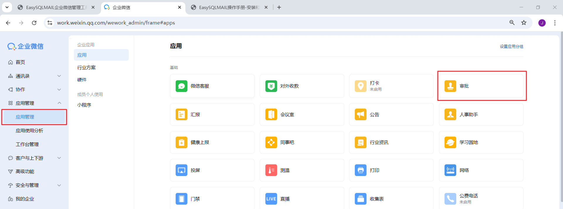 (1) 在企业微信管理平台的"应用管理"中打开"审批"应用。