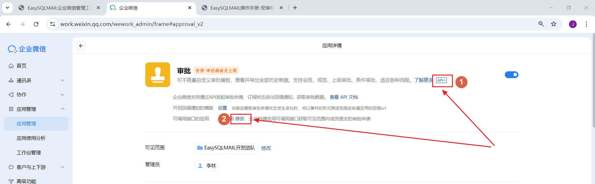 在开始使用"审批流程监控"功能前,您需要在企业微信管理平台中为您的企业微信应用添加"审批接口API调用权限"。具体步骤如下: