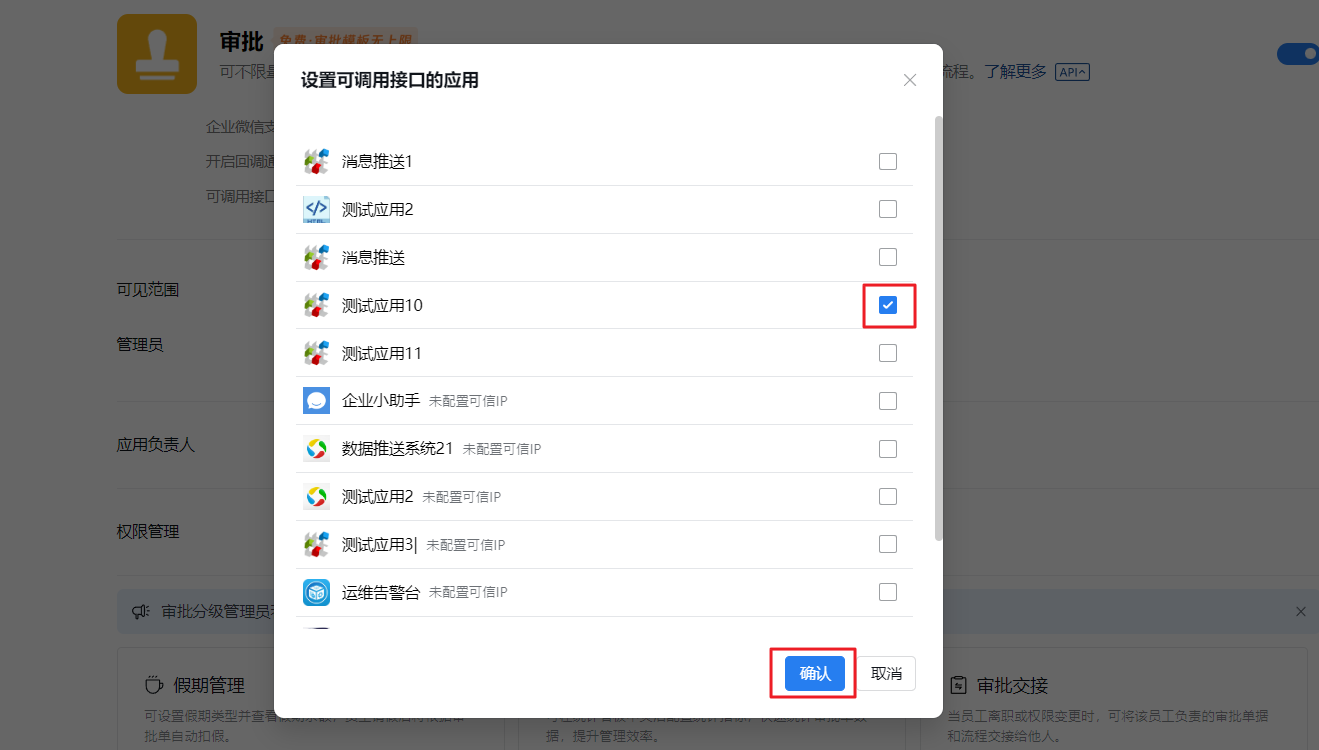 (3) 在"设置可调用接口的应用"对话框中勾选您的应用,然后点击"确认"。