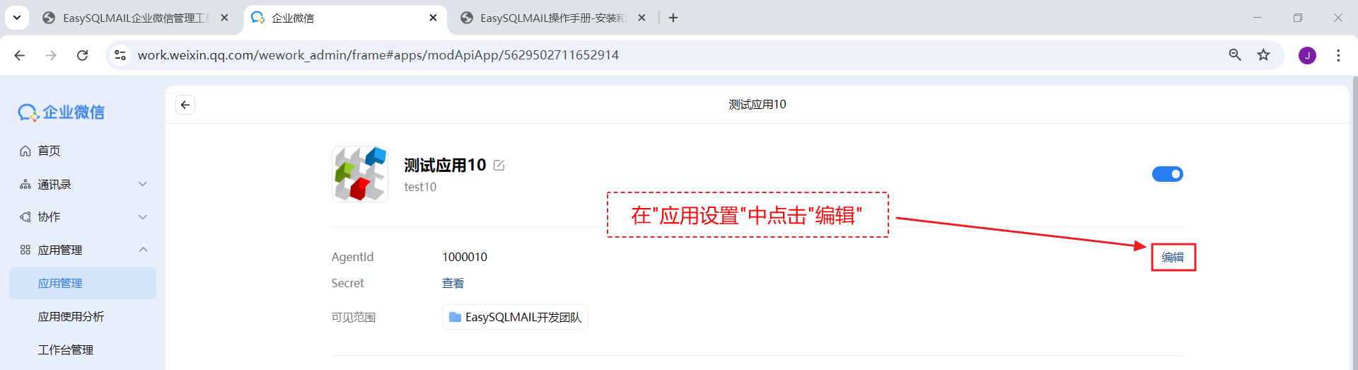 (1) 在企业微信管理平台的"应用管理"中打开您的应用,然后点击"编辑"。