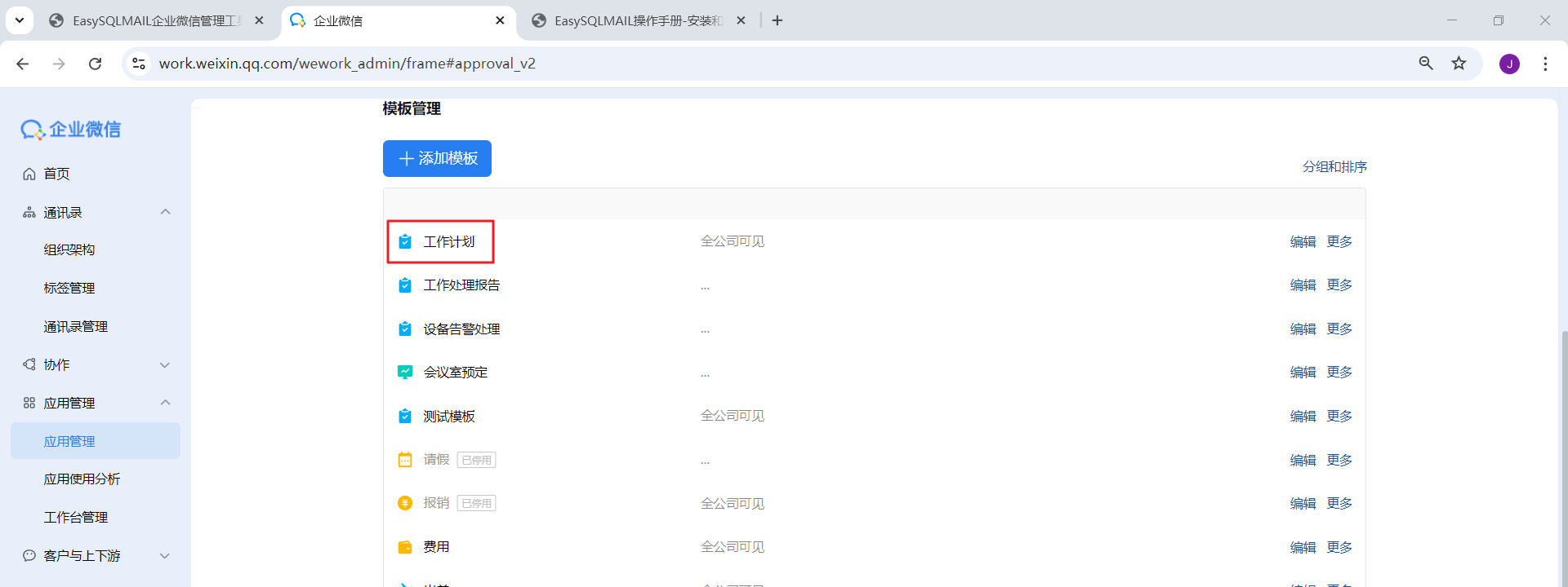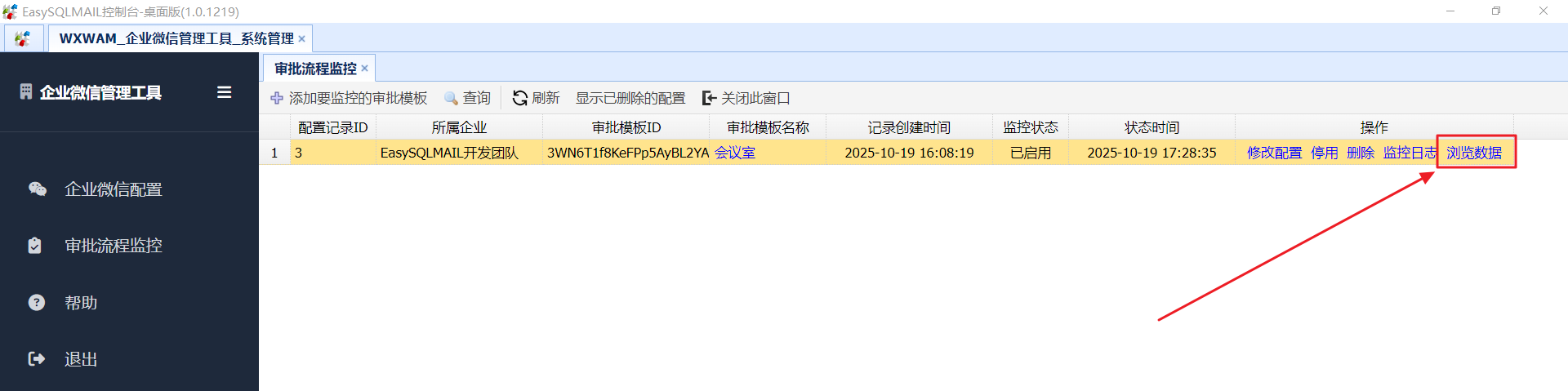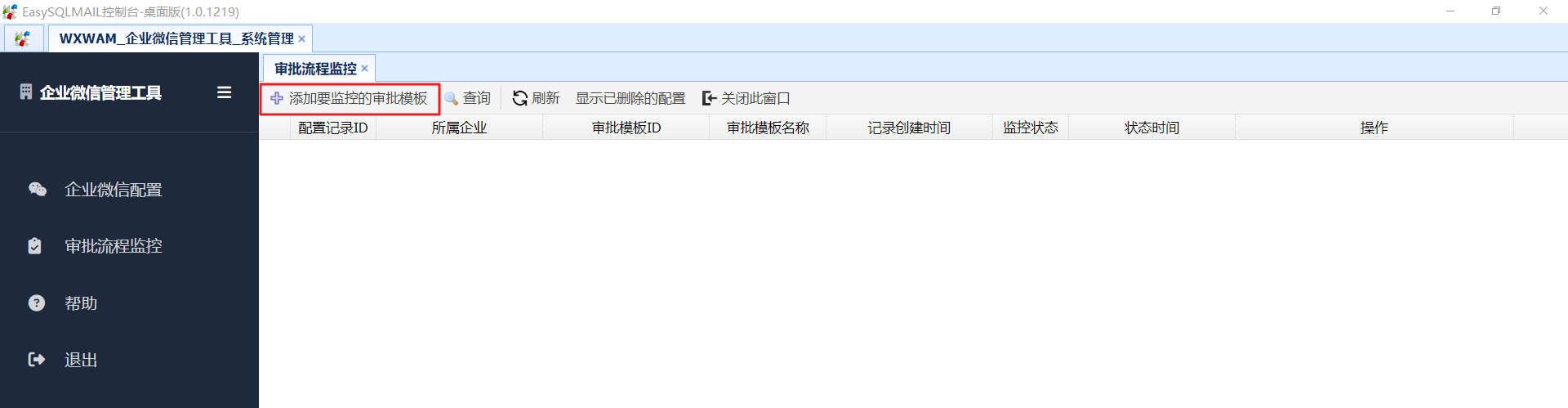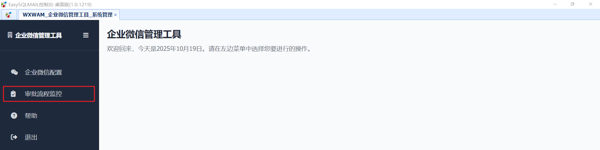 EasySQLMAIL企业微信管理工具中提供了企业微信审批流程监控功能。您可以利用此功能来监控审批流程,在审批结束时把审批数据保存到本地数据库中以便于查询和统计。