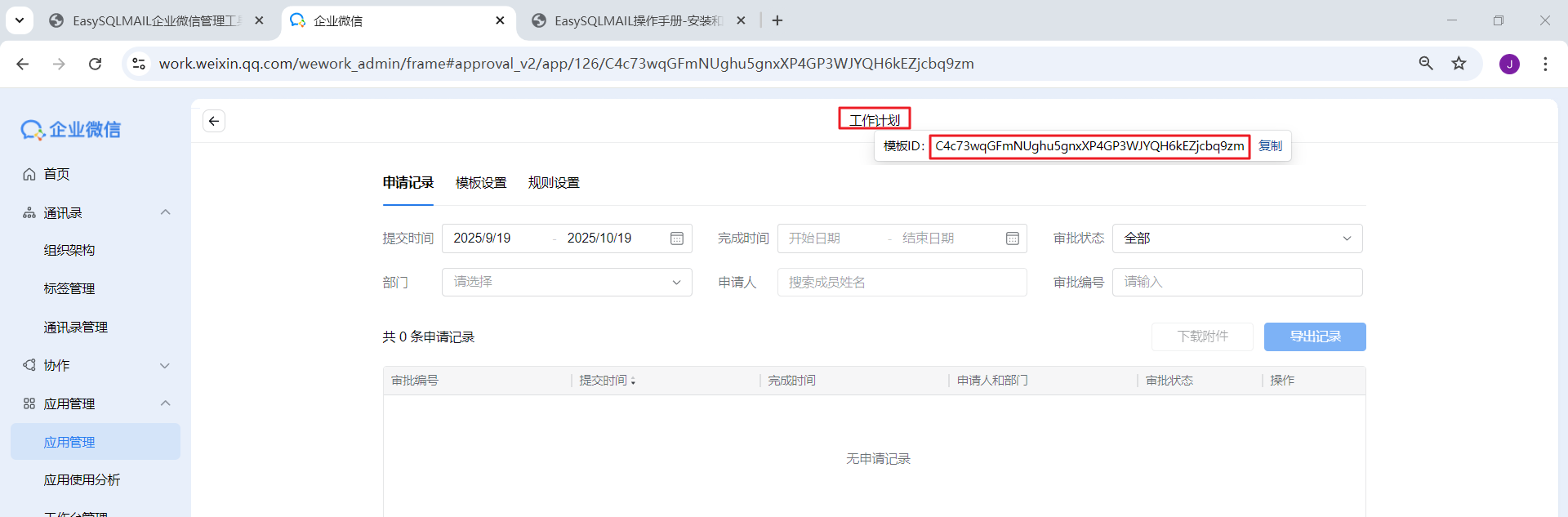 审批模板ID 是企业微信为每个审批模板自动生成的一串唯一标识符。在后面的配置中需要用到这个标识符。