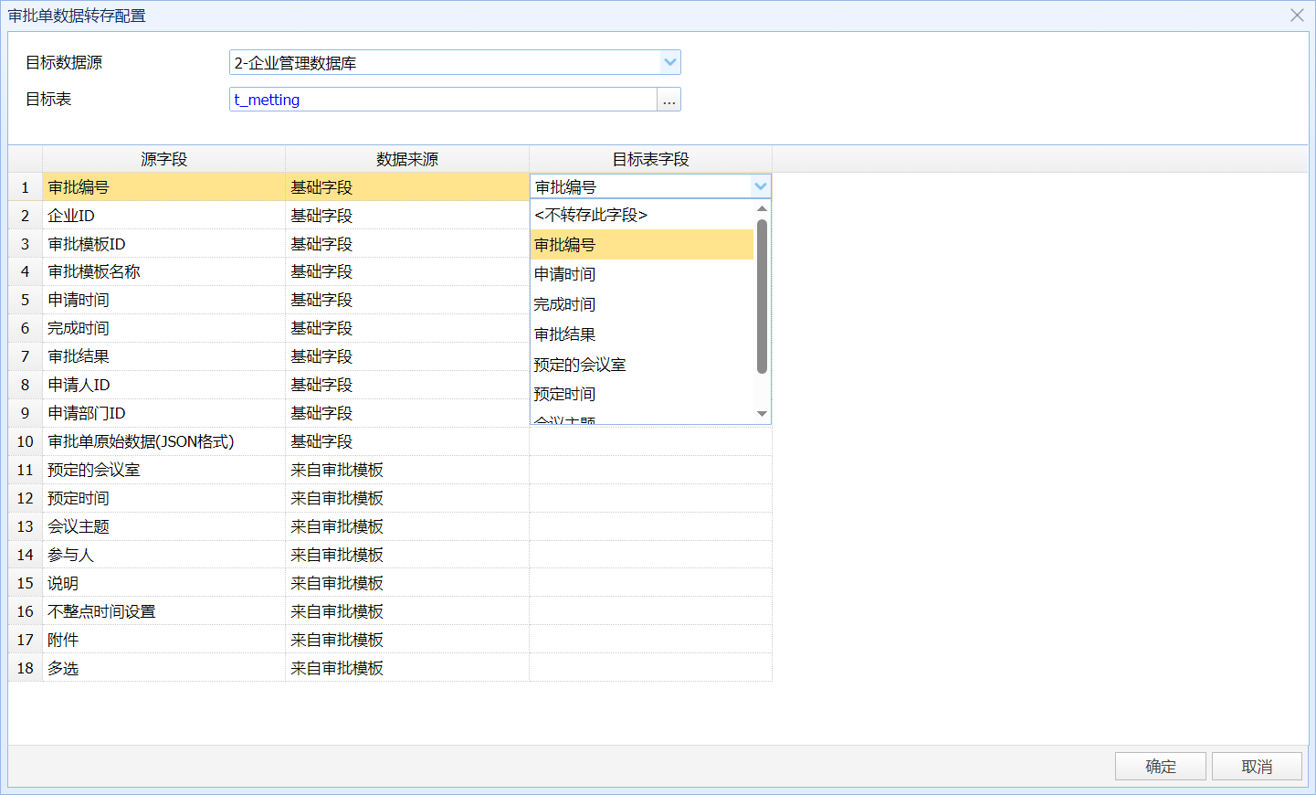 您可以在字段列表中点击"目标表字段"设置每个字段对应的目标表字段。系统会按您的配置把审批数据保存到目标表的对应字段中。 |