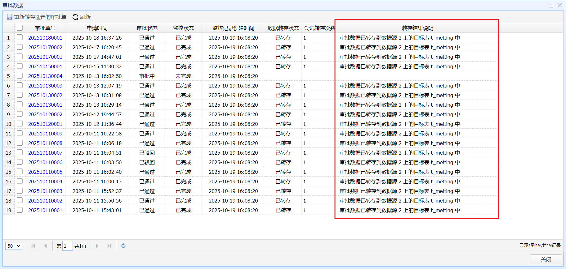 (3) 如果要重新转存审批数据,请先在目标数据源上删除已转存的数据,然后在上面的列表中勾选要重新转存的审批单,点击"重新转存选定的审批单"按钮即可。