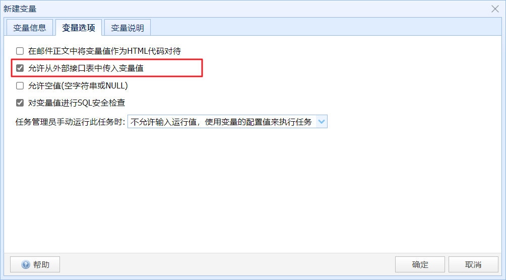 勾选变量的"允许从外部接口表中传入变量值"选项