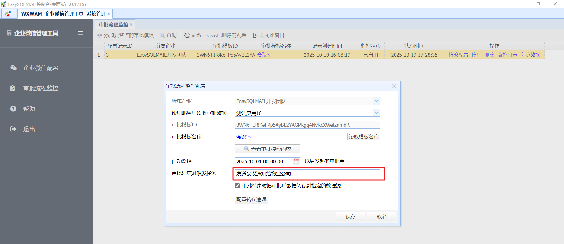 (2) 在 EasySQLMAIL企业微信管理工具 的 "审批流程监控"配置界面中点击对应的审批模板,打开"审批流程监控配置"对话框,并在"审批结束时触发任务"文本框中输入配置好的任务的名称,然后点击"确定"。