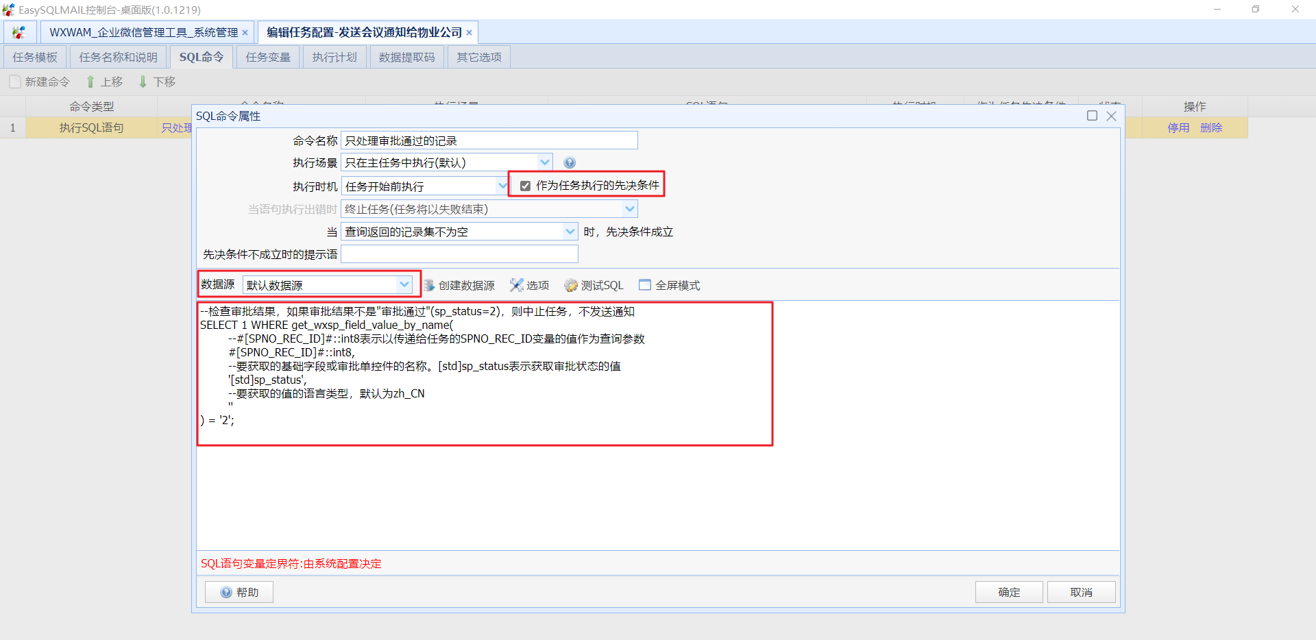 (2) 为任务添加一个先决条件,确保只为"审批通过"(sp_status=2)的流程发送通知。