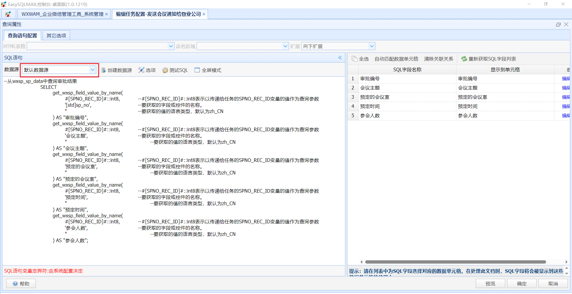(1) 在EasySQLMAIL中配置一个邮件任务,任务名称为"发送会议通知给物业公司"。