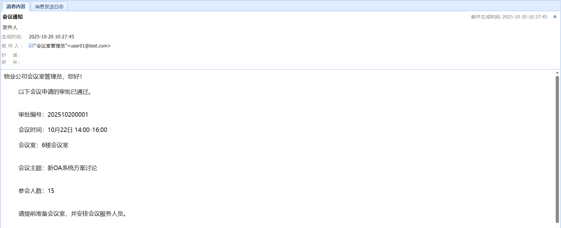 这里以"会议室"审批为例,在审批通过时,调用"发送会议通知给物业公司"任务向物业公司发送一个邮件,通知物业公司提前准备会议室。